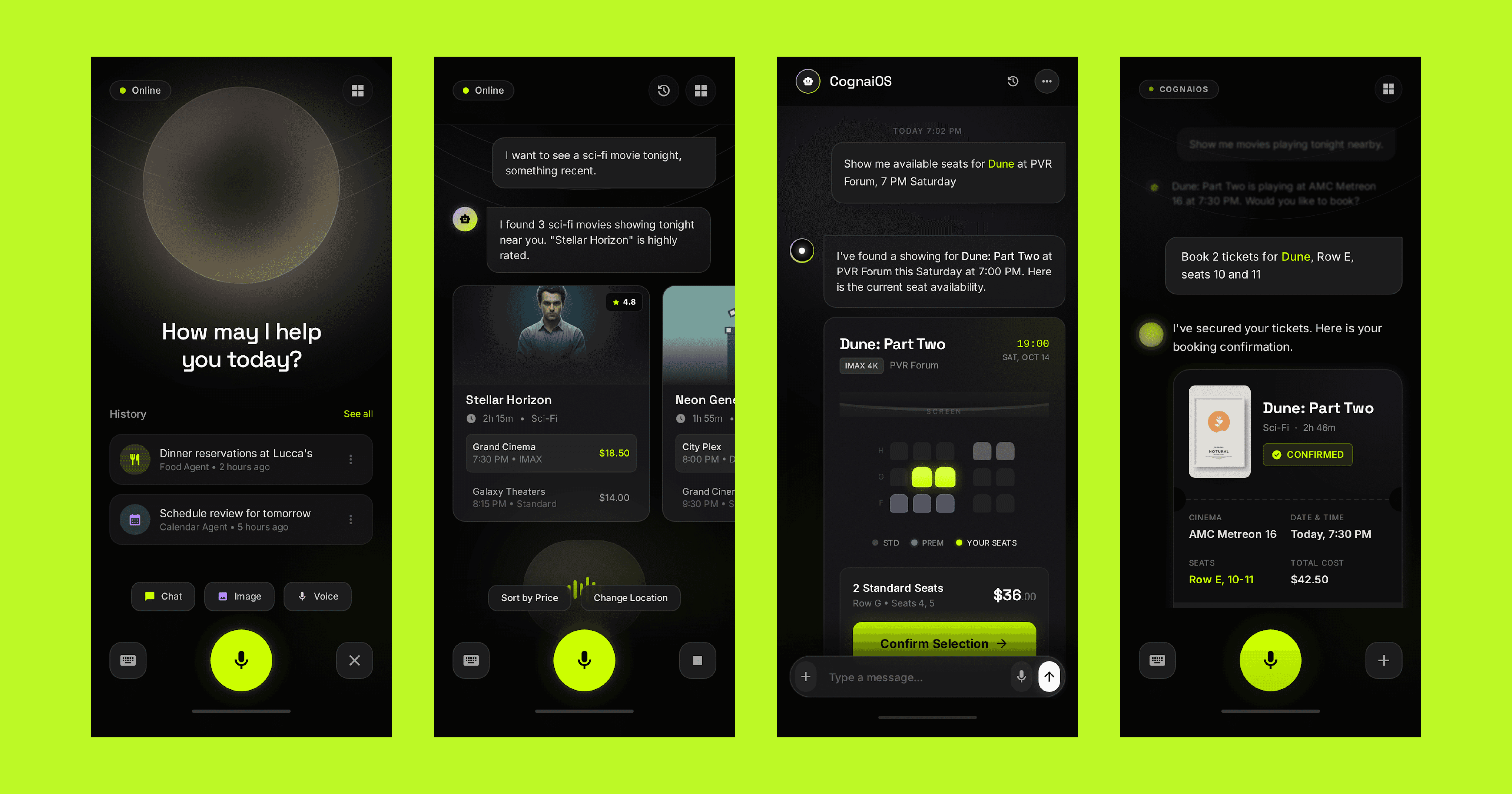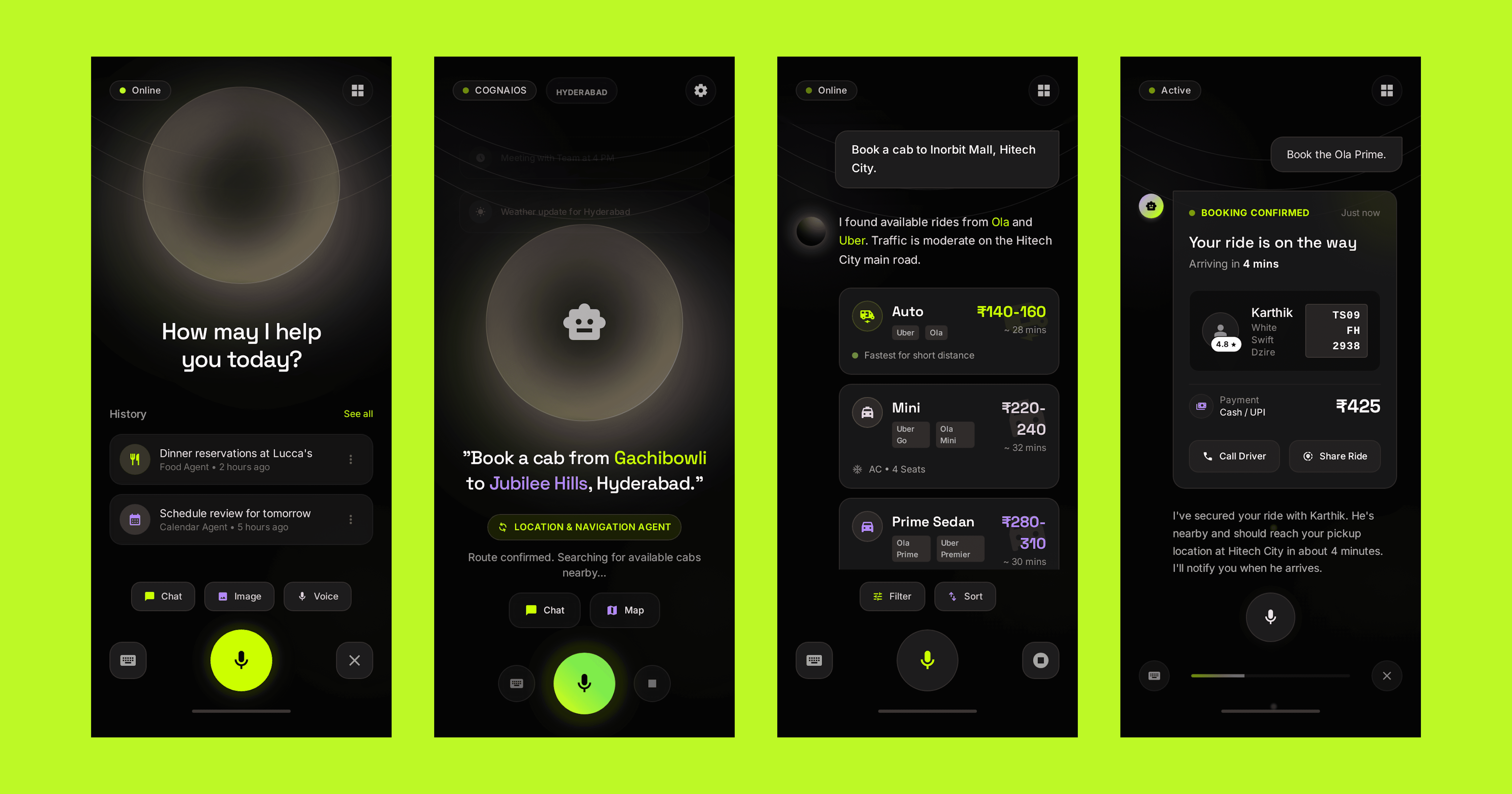 State intent (type/voice) → Agent gathers options via APIs → Shows one compare card → Confirm → Live card on Home → Auto-save to Memory (editable)